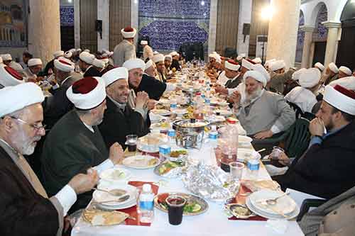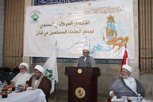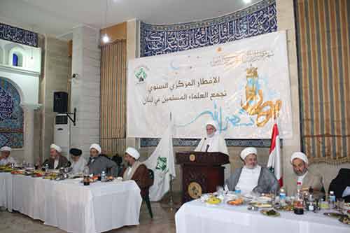 "ورد في ما رواه الشيخ الصدوق رحمه الله في كتاب عيون أخبار الرضا عليه السلام في الحديث المروي عن خطبة رسول الله(ص) في استقبالِ شهرِ رمضانَ المباركِ أنه عند انتهاءِ الخطبةِ وقفَ أميرُ المؤمنينَ عليٌّ بنُ أبي طالبٍ عليه السلام وقال: "يا رسول الله ما أفضلُ الأعمالِ في هذا الشهر فقال صلى الله عليه وآله وسلم يا أبا الحسنِ أفضلُ الأعمالِ في هذا الشهرِ الورعُ عن محارمِ الله ثم بكى، فقلت يا رسول الله ما يُبكيك؟ فقال: يا عليّ أبكي لِمَا يُستَحَلُّ منكَ في هذا الشهرِ كأني بكَ وأنتَ تصلي لربكَ وقد انبعثَ أشقى الأولينَ والآخرينَ شقيقُ عاقرِ ناقةِ ثمود فضربكَ ضربةً على قِرنِكَ فخضّبَ منها لحيَتَك. فقال أميرُ المؤمنين عليه السلام : يا رسول الله وذلك في سلامةٍ من ديني؟ فقال صلى الله عليه وآلِهِ وسلم: في سلامةٍ من دينك". يُصادفُ اليومَ كما تعرفونَ ذكرى شهادةِ أميرِ المؤمنينَ عليه السلام الذي قتَلَهُ أشقى الأولينَ والآخرينَ عبدُ الرحمنِ بنُ ملجمٍ لعائنُ الله عليه، وعندما قررنا أن يكون إفطارُنا اليومَ لم نكنْ ملتفتينَ إلى هذهِ المصادفةِ ولربما هي صدفةٌ خيرٌ من ميعاد، فالتاريخُ سادتي العلماءَ يُعيدُ نفسَهُ ولئنْ ابتُلي الصحابةُ الأوائلُ والخلفاءُ الراشدون بالخوارجِ فإن أمتنا ابتُلِيَتِ اليومَ بمنْ هم أسوأُ من الخوارجِ ممن يتّسِمونَ بالإسلام والإسلام منهم براءٌ وهم صنيعةً أجهزةٍ مخابراتيٍة صهيو/أمريكية ينفّذونَ إرادةَ المستكبرِ وهمُّهم هَمُّ سيِّدِهم وهو القضاءُ على المقاومةِ ليس بعنوانِ انتمائها المذهبيِّ بل بما هي خطٌّ جهاديٌّ في الأمةِ أحسَنَ تصويبَ بوصلتِهِ وأجادَ في اختيارَ أولوياتِهِ فاعتبرَ أن العدوَّ الأولَ للأمةِ هو العدوُّ الصهيونيُّ وأنَّ لا عدوَّ له في داخلِ الأمةِ لا من المسلمينَ ولا من المسيحيينَ بل ولا من اليهودِ غير الصهاينة. أيها السادة العلماء: بمناسبة ذكرى استشهاد الأمير عليه السلام أسمحوا لي أن استشهدَ بكلامِ رسولِ الله(ص) وكلامِ أميرِ المؤمنين للتأكيد على الثوابت التالية: 1- أنْ يختارَ رسولُ الله(ص) مناسبةَ قدومِ شهرِ رمضانَ المباركِ ليصرِّح بإعجازٍ إلهيٍّ عن حادثةٍ ستقعُ في القادمِ من الزمانِ محدِّداً زمانَ الاستشهادِ وكيفيتِهِ إنما هو ليحدِّدَ بشكلٍ واضحٍ لا لُبْسَ فيه أن طريقَ الصوابِ هو ما سيختارُه أميرُ المؤمنين عليه السلام، فعليٌّ كما قال(ص) مع الحق والحق مع علي يدور معه حيثما دار وبالتالي فإن الخوارجَ بنصِّ رسولِ الله (ص) هم تماماً كمنْ عَقَر ناقةَ صالحٍ عليه السلام. 2- أَنْ يؤكِّدَ الإمامُ عليٌّ على أن يكونَ في سلامةٍ من الدينِ دون التفاتٍ إلى أيةِ حيثياتٍ أخرى هو ما يجب علينا أن نتّخذهُ دائماً في عملنا، أن تكونَ مرضاةُ الله الهدفَ الذي نسعى إليه. 3- إن طريقةَ تعاملِ أميرِ المؤمنينَ عليه السلام مع الأمةِ الإسلامية على قاعدةِ الحفاظِ على الرسالةِ والدعوةِ ولو أدى ذلك لذهابِ السلطةِ هو نهجُ الأولياء والصالحين "لأُسالِمَنّ ما سلمتْ أمورُ المسلمين وإن لم يكن من جورٍ إلا عليَّ خاصةً".