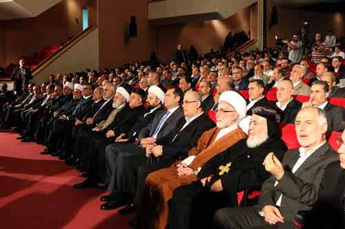 بداية، النشيدان اللبناني والإيراني، ثم فيلم قصير تلا فيها الإمام الخامنئي كلمة رثاء في رحيل الإمام الخميني. وقد ألقى رئيس مجلس الأمناء سماحة الشيخ أحمد الزين كلمة تجمع العلماء المسلمين فقدم مقارنة سريعة بين اتجاهين واضحين للعيان، وقال: "إن الاتجاه الأول هو اتجاه الجمهورية الإسلامية الإيرانية الملتزم بالإسلام، وتأكيده على الوحدة الإسلامية بين الشعوب الإسلامية. أما الاتجاه الثاني فيعكس ما تفعله الجهات الأخرى التي تفرق وتساندها الصهيونية وأمريكا كما نشاهد في سائر البلاد العربية". أضاف: "نحن في لبنان نلتقي مسلمين ومسيحيين على خط الإمام الخميني الحضاري، ونؤكد على خيار المقاومة الوطنية الإسلامية". وحيا الأمين العام "لحزب الله" السيد حسن نصر الله، وقال: "ليعلم الجميع أننا على خط الجمهورية الإسلامية الإيرانية وبقيادة السيد حسن نصر الله سنكون في المسجد الأقصى قريباً".