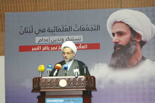 كلمة لقاء علماء بيروت الشيخ محمد بشكر: علينا أن نتضافر وأن نتوحد لمواجهة هذه الطغمة الفاسدة، الأمر لن يطال الشيعة فقط بالأمس القريب سمعنا ورأينا نالوا من الشيخ المجاهد البوطي واليوم نالوا من الشيخ نمر باقر النمر فهؤلاء لا يتورعون من قتل المؤمنين فكيف بالعلماء والمصلحين والذين يعملون من أجل خدمة الناس، نؤكد على أهمية أن نكون يداً واحدة شيعة وسنة وكل الأحرار والأخيار والشرفاء في هذا العالم لمواجهة هذه المؤامرة الكبرى التي تشد بعض الدول من أجل الدخول في آتون الفتن من الحروب المتنقلة هنا وهناك ودفعنا للفتنة، لن ننجر إلى هذه الفتن، ونحن على رأس الداعين إلى الإصلاح في هذه الأمة. كلمة تجمع العلماء المسلمين للقاضي الشيخ أحمد الزين رئيس مجلس الأمناء: قضية الشيخ النمر قد تتجاوز هذه الحالة لتتناول قضية الأمة الإسلامية وما تعاني من فوضى وانهزام ويظهر هذا الانهزام بشكل صريح ومعيب في القدس الشريف وفي القضية فلسطين. أين هم السياسيين، هناك دعوا الدول العربية كي تشكل حلفاً مع الدول الإسلامية. حلفاً بوجه إيران، وتستجيب الدول العربية وبعض الدول الإسلامية لهذه الدعوة ليشكلوا حلف ليس لمواجهة إسرائيل ولا لحماية المسجد الأقصى و إنما لتأكيد السياسة الصهيونية ولتعزيز التفرقة والإنهزام في العالم الإسلامي. كلمة تجمع علماء جبل عامل الشيخ عبد الرسول حجازي: إنَّ إعدام سماحة الشيخ النمر على خلفية مواقفه الإصلاحية جريمة بحق الإنسانية وبحق الإسلام في آن. لقد استنكرنا واستنكر كل حر هذه الجريمة ولكن السؤال اليوم ماذا عن سجناء ومعتقلي الرأي الباقين؟؟ إننا نخشى على العلماء والناشطين الحقوقيين في البحرين وفي غيرها من أن يلاقوا نفس المصير. يا علماء الإسلام ويا أحرار العالم قوموا وابذلوا كل جهد ممكن لتشكيل رأيٍ عام ضاغط على هذه الحكومات الجائرة الظالمة لوقف عدوانها على مواطنيها. كلمة رئيس اتحاد علماء المقاومة الشيخ ماهر حمود: نتوجه مباشرة إلى الملك سلمان والأمير محمد بن نايف والأمير محمد بن سلمان نقول لهم: أوكلت إليكم دماء وأموال المسلمين وأعراضهم، أتقوا الله لأنكم تلعبون بدماء وأموال المسلمين، فاتقوا الله اتقوا الله لأنكم تلعبون بدماء المسلمين في اليمن وفي الشام وفي كل مكان، وتغدقون المال وهذا المال شقيق الروح أحياناً وهو مال المسلمين إن غرتكم قوة، وإن كنتم لا تجدون من ينصح ويخاف أن ينصحكم فنحن نقول من هنا وعبر الأثير:" اتقوا الله قبل أن عاصفة الله و ريحاً صرصرا عاتية من الله بدلاً عن عاصفة الحزم المجرمة التي تقودون، اتقوا الله قبل أن تنتهي الأنفاس ، ولا تظنوا أن القوة التي بأيديكم ستغنيكم يوم القيامة، بل في الدنيا عندما تتغير الوجوه ولعلها ستتغير بإذن الله تعالى. ونقول لعلماء السوء الذين يسرون على نهجهم كذبتم والله عندما قلتم هي حرب سنية شيعية، بل هي حرب استكبار في العالم الذي تخوضه أمريكا وإسرائيل وتنفذه الرياض وباقي بعض عواصم العرب وبين الذي يريد أن يواجه أمريكا ويريد أن يزيل إسرائيل، بين الذي يقاوم ويدفع الدماء الذكية على طريق الإسلام الجامع وليس إسلام المذاهب الذي تفرقون على طريق الإسلام يسير علماء المقاومة وأبطال المقاومة في لبنان وفلسطين فغي كل مكان فيه وجود أمريكي أو إسرائيلي أو استعماري والغلبة في النهاية للحق لأن هذه المرحلة نهايتها زوال إسرائيل، وأنتم لستم من هذا. كلمة الهيئة العلمائية في جبهة العمل الإسلامي الشيخ زهير الجعيد: نقف اليوم لنردد ونقول إن الشيخ نمر النمر ليس شهيداً لمذهب أو شهيد لطائفة إنما هو شهيد الإسلام، رغم تحفظاتنا على بعض مواقفه السياسية والدينية ولكن إنه كلمة حق في وجه السلطان الجائر و الظالم، هذا السلطان الذي يضرب عرض الحائط ليس فقط لمذهب أهل السنة ولكنه يضرب عرض الحائط بالإسلام فيحرف الإسلام عن معانيه ويحرفه عن كل معناً سامي فينشر القتل والذبح وينشر الاغتصاب باسم الإسلام، هذا ما فعله آل سعود مع العلماء المسلمين من السنة من الأشاعرة في بلاد ا
