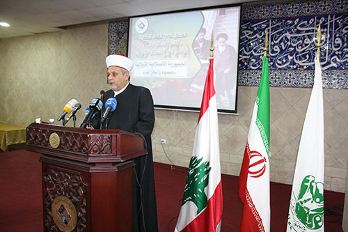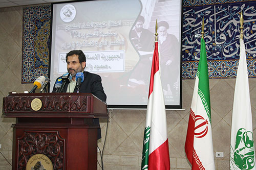 الفساد هو الشيطان الأكبر أمريكا الذي يحمي الغدة السرطانية في منطقتنا الإسلامية خامساً، الوحدة: لقد دعا الإمام الخميني (قده) منذ بداية الثورة إلى الوحدة الإسلامية وأكد عليها ودعا المسلمين للاحتفال بأسبوع الوحدة الإسلامية معتبراً أن أعداء الأمة يسعون لإثارة الفتن بين جناحي الأمة السنة والشيعة، فدعا إلى الوحدة في مواجهة الهدف الصهيوني- الأمريكي، وهذا الأمر الذي ما زلنا نعاني منه اليوم في إطار خلق فتن بين المسلمين تُهيئ للصهاينة الهيمنة علينا وتوقعنا في الفشل والهزيمة، وتخترع لنا عدواً غير العدو الحقيقي هو سبب تخلف العديد من الدول إن لم نقل عمالتها في حين أن فهمه يكون سبباً للرقي والتمدن والتقدم. كثيرة هي العناوين التي يمكن الحديث عنها، اكتفي بهذا المقدار تاركاً للإخوة أن يفيدونا بما عندهم. كلمة المستشار السيد محمد مهدي شريعتمدار: ثم ألقى المستشار السيد شريعتمدار كلمة تناول فيها حول تعاون الجمهورية الإسلامية مع الآخرين بعد كثير من المؤامرات التي دُبرت ضد إيران وخلق مشاكل وحروب وحصار اقتصادي وضغوطات وتهديد بالهجوم العسكري الأمريكي مستغلين الموضوع النووي، وتابع شريعتمدار أن الإمام الراحل بذل جهود كثيرة خلال سنين متتالية في دعوة شعبه للوحدة في ظل من الصراعات المذهبية التي تبناها الإعلام المأجور إلى تشويه انجازات الثورة. وأشار شريعتمدار إلى الانجازات التي حققتها الجمهورية الإسلامية في جعل مشاركة كافة الطوائف والمذاهب الإسلامية والمسيحية في المشاركة بالحكومة والبرلمان وعلى المستوى المحافظات والقوات العسكرية والأمنية وحتى الطائفة اليهودية لهم ممثل في البرلمان. كلمة الأب مكرديش كيشيشيان: ثم ألقى الأب كيشيشيان كلمة تقدم فيها بأسمى آيات الشكر والتهاني للجمهورية الإسلامية ، ثم تطرق للعلاقة ما بين الجمهورية الإسلامية ووجود الأرمن في إيران وعلاقة جمهورية أرمينا على مستوى الدولة وعلى مستوى التبادل الدبلوماسي والخبرات خصوصاً بعد الاتفاق النووي . وأشار كشيشيان إلى الحوار المتبادل والمستمر بين الجمهورية الإسلامية والشعب الأرمني، ولدينا ثلاث أبرشيات وكنائسنا مفتوحة وصلواتنا ترفع لله ومدارسنا تعلم حضارتنا نطبقها ضمن الشرائع ونعمل واجباتنا تجاه الدولة، ونتجه في سبيل ترسيخ الروابط التي تجمعنا خدمة للإنسان بغض النظر عن عقيدته ودينه ونسأل الله أن تستمر الجمهورية نحو الرقي في خدمة البلاد والعباد. كلمة سماحة الشيخ ماهر حمود: وفي الختام ألقى الشيخ ماهر حمود كلمة جاء فيها: إن الذي يميز احتفالنا بذكرى انتصار الثورة الإسلامية بأنها ليست ذكرى مرت وانقضت بل هي ماثلة اليوم كما في التاريخ وأيضاً في المستقبل، وأن الحرب الإسلامية والسياسية على إيران تستعمل لفظاً مستجداً حول "العروبة" بمعنى يتحدثون عن عرب في مقابل الفرس وبهذا المعنى العروبة جاهلية وليست عروبة الإسلام، وتساءل أي عروبة تريدون، العروبة التي تنطقون بها اليوم عروبة جاهلية مزيفة كما يريدها الأمريكي والتركي ، وأين عروبتكم وأنتم تنصتون إلى اغتصاب فلسطين وتهاجمون المقاومة التي أنارت وانتصرت على أعداء الأمة، بل أنتم أيها العرب لا تعلمون أين المصلحة ، حتى لو عرفتم أيم المصلحة فأنتم لا تريدونها ،انتم تريدون أمريكا وتعبدون الكرسي. وختم بأن البديل قادم وبعد 37 من الأعوام لن يقدر ولن يقف أحد في وجه الجمهورية الإسلامية الإيرانية التي تدعو وعملت إلى وحدة الأمة ونبذت التفرقة بين المذاهب كافة إسلامية ومسيحية والتي تحملت المسؤولية في دعم المقاومة في لبنان وسوريا والعراق وفلسطين.