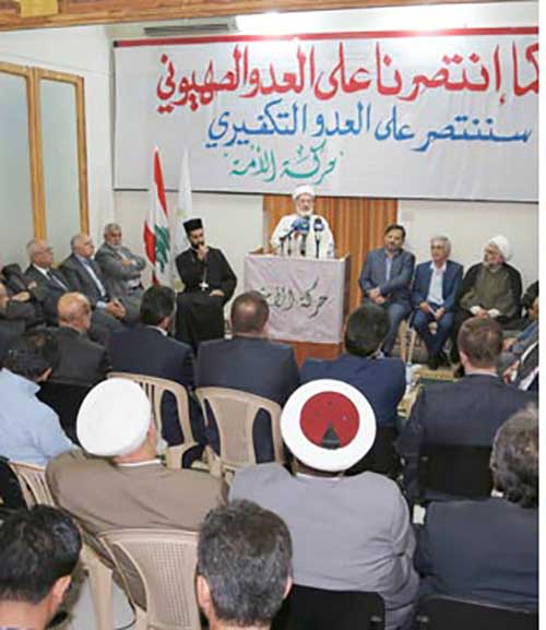 أمين عام حركة النضال اللبناني العربي فيصل الداوود الذي اعتبر أن "المقاومة هي الخيار الصحيح والقرار السليم لطرد الاحتلال، وهذا ما حصل في لبنان، وتكرر في غزة، وسيحصل في الجولان، الذي بدأت تتكون فيه مقاومة شعبية مستندة إلى بيئة حاضنة في البلدات المحتلة؛ في مجدل شمس وعين قنيا وبقعاتا وعين الثينة، التي رفضت التهويد بالامتناع عن حمل الهوية "الإسرائيلية"، والاحتفاظ بالجنسية السورية، وإبقاء التواصل مع الدولة السورية. ثم بدوره أشار الشيخ حسين غبريس الذي ألقى كلمة رئيس الهيئة الإدارية في تجمع العلماء المسلمين الشيخ حسان عبد الله، إلى أن "المقاومة أصبحت منهاج حياة لأمة العرب والإسلام، ولم يعد في قاموسنا كلمة هزيمة، لأن حلاوة الانتصار أصبحت سنة مقدسة لنا، رغم أنف كل من يكره السنن المقدسة في حياة الأمة. من هنا نخاطب كل أحرار العالم للوقوف معنا في مواجهة هذا العدو الهمجي، ونعدكم بالوقوف في مواجهة هذا العدو، مهما بلغت قوته". من جهته أشار مسؤول الجبهة الشعبية لتحرير فلسطين - القيادة العامة في لبنان أبو عماد رامز إلى أن "زمن الهزائم قد ولى إلى غير رجعة، والمقاومة ليست إرهاباً، ولن يكون بدر الدين آخر الشهداء، وسنبقى على العهد سائرون مهما بلغت التضحيات. أمين الهيئة القيادية في حركة الناصريين المستقلين - المرابطون العميد مصطفى حمدان بدوره أكد أنه "لو أن "حزب الله" لم يتدخل في سوريا، ولم يشارك مع الجيش اللبناني في القتال لحماية الحدود اللبنانية من الجماعات المسلحة الإرهابية، لكان كل المعترضين على تدخله خارج البلاد في خبر كان، فلولا حزب الله لكان لبنان مسرحا للعمليات التكفيرية". بدوره لفت المستشار الثقافي في سفارة الجمهورية الإسلامية الإيرانية محمد شريعتيمدار إلى أن زمن الانتصارات مؤرخ في المنطقة بانتصار ثورة الإمام الخميني في إيران، وهذا الزمن سيثمر، بالرغم من الاتهامات الموجهة "لحزب الله" بالإرهاب، ولمن يمده ويساعده، فدولة الصهاينة تخطط للسيطرة على القرار في المنطقة، بمساعدة القوة الأمريكية، لكن مواجهة المقاومة والأحرار متواصلة لمواجهة هؤلاء الأعداء". وأشار ألامين العام لحركة الأمة الشيخ عبد الناصر جبري إلى أن "ظروف المقاومة ما تزال قائمة، وما يخطَّط للمنطقة من الصهيو/أمريكي لسرقة ثروات شعوب هذه المنطقة بات مفضوحاً".