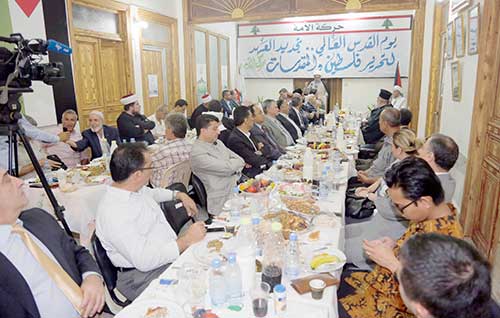 بداية الحفل كانت مع آيات بينات من القرآن الكريم، وكلمة ترحيبية من الشيخ إبراهيم البريدي، ألقى بعدها الأب جراسيموس عطايا كلمة قال فيها: "الشعب الفلسطيني يقاوم الاحتلال ويدافع عن المقدسات هذا الشعب بمسلميه ومسيحيه.. لقد رفض الاستسلام، وقاوم، ومع الأسف الشديد، هناك الكثيرون في عالمنا يغلقون أعينهم ويصمّون آذانهم تجاه ما يحدث بحقهم، وعلينا أن نعمل معاً ونرفض الطائفية والتطرف والكراهية، من أجل تحقيق العدالة وإزالة الاحتلال، ولن يزال إلا بوحدتنا". رئيس هيئة العمل التوحيدي سماحة الشيخ سامي أبو ذياب قال: "في هذه المناسبة التي تحمل في طياتها كل المعاني النبيلة والقيم، علينا أن نكون يداً واحدة في غمار هذه الحرب الكونية التي تجتاح عالمنا العربي والإسلامي. إن استعادة القدس الشريف وفلسطين دَين في أعناقنا، وتحريرها يحتاج إلى تحالف استراتيجي عربي ودولي؛ من الهند إلى إيران إلى سورية، ومن الصين وكوريا إلى روسيا، وسائر البلدان التي تقف سداً منيعاً في وجه الاستكبار العالمي والصهيوني". رئيس الهيئة الإدارية في تجمع العلماء المسلمين سماحة الشيخ د. حسان عبد الله أشار إلى أن يوم القدس العالمي يأتي في وقت هام من تاريخ القضية الفلسطينية، فالأمة تمرّ بمأزق كبير، حيث يجهد العالم المستكبر لتوجيه ضربة قاضية للقضية، من خلال الفتنة التي يعمل على تسعيرها داخل الأمة، والقضاء على إمكانات الشعوب العربية والإسلامية، وهنا يحق لنا أن نسأل حكام العالم العربي: هذه الطائرات التي تستعملونها اليوم لقتل الأبرياء في اليمن، والجيوش التي تنشروها لقمع حركات التحرر في أوطانكم، أين هي من فلسطين؟ ولمصلحة من خضتم الحرب على سورية؛ الدولة الوحيدة الممانعة للاستسلام للعدو الصهيوني، والداعمة للمقاومة؟ ومن المستفيد من هذه الحروب سوى العدو الصهيوني. أمين عام حركة الأمة سماحة الشيخ د. عبد الناصر جبري قال: عندما نتكلم عن يوم القدس العالمي نستذكر الصرخة التي أطلقها الإمام الخميني (قدس) ضد قوى الاستعمار والاستكبار.. إن قضية القدس يجب أن تعود إلى صلب اهتمامات الأمة بشعوبها وقادتها، انطلاقاً مما تمثله من معانٍ دينية وإيمانية، ووصولاً إلى دورها السياسي والواقعي على مستوى مصير الأمة ومستقبلها. إن لقاءنا الإسلامي - المسيحي اليوم على مائدة الرحمن بعد أن طاولت يد الإجرام بلدة القاع الآمنة، في محاولة للنيل من لبنان، رسالة إلى كل المتربصين بأمن وطننا؛ بأن تضامن اللبنانيين وتلاحمهم مع الجيش والمقاومة سيردّ كيدهم الحاقد، وسيحمي الوطن من كل الشرور.